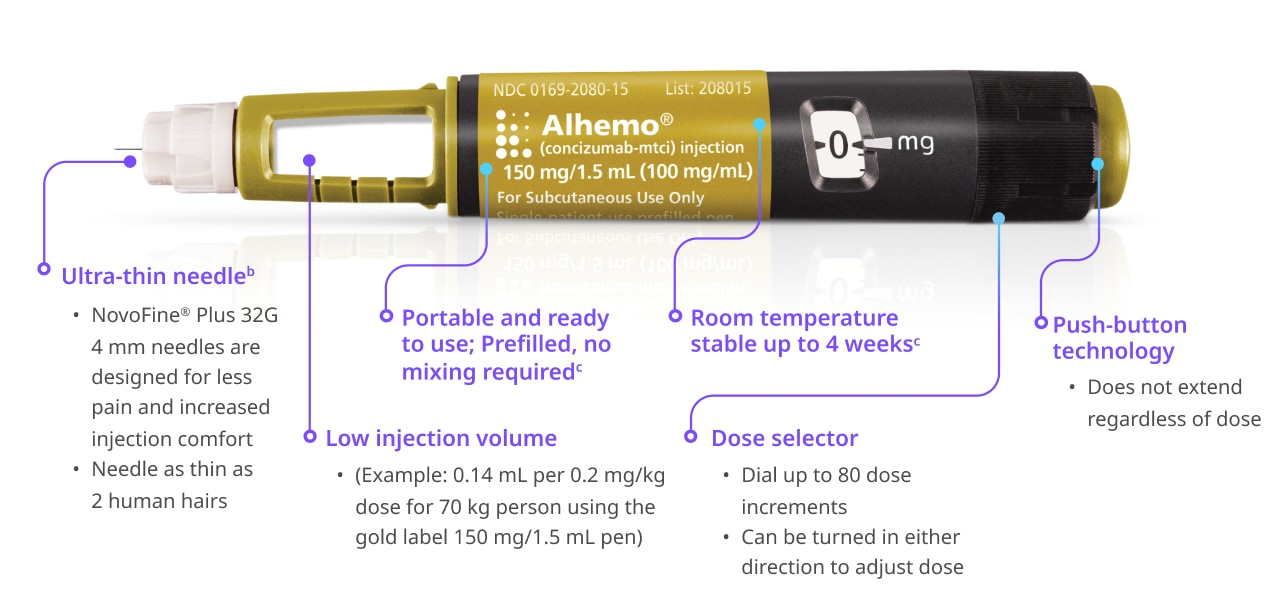 | Alhemo® is the first prophylaxis treatment in a prefilled, subcutaneous pen to prevent or reduce frequency of bleeding episodes in adults and children 12 years of age and older with hemophilia B with inhibitors or hemophilia A with inhibitors. |