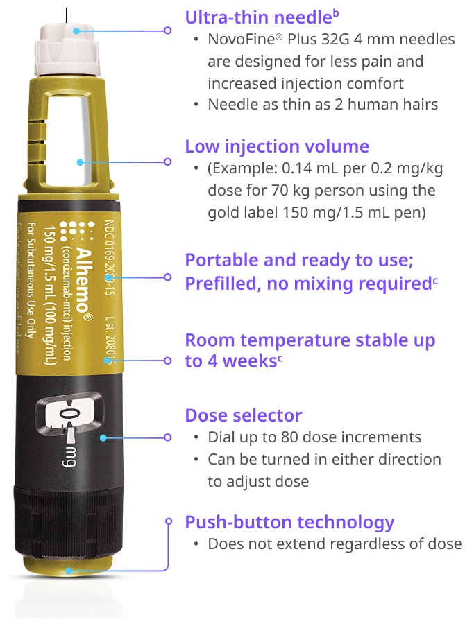 | Alhemo® (concizumab-mtci) injection 60 mg, 150 mg, or 300 mg is a prescription medicine used for routine prophylaxis to prevent or reduce the frequency of bleeding episodes in adults and children 12 years of age and older with hemophilia A with factor VIII inhibitors or hemophilia B with factor IX inhibitors. |
