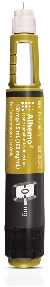 | Alhemo® (concizumab-mtci) injection 60 mg, 150 mg, or 300 mg is a prescription medicine used for routine prophylaxis to prevent or reduce the frequency of bleeding episodes in adults and children 12 years of age and older with hemophilia A with factor VIII inhibitors or hemophilia B with factor IX inhibitors. |
