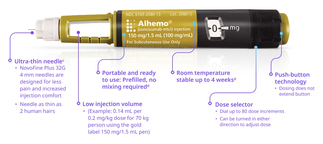 Alhemo® (concizumab-mtci) injection 60 mg, 150 mg, or 300 mg is a prescription medicine used for routine prophylaxis to prevent or reduce the frequency of bleeding episodes in adults and children 12 years of age and older with hemophilia A or B with or without factor VIII or IX inhibitors.