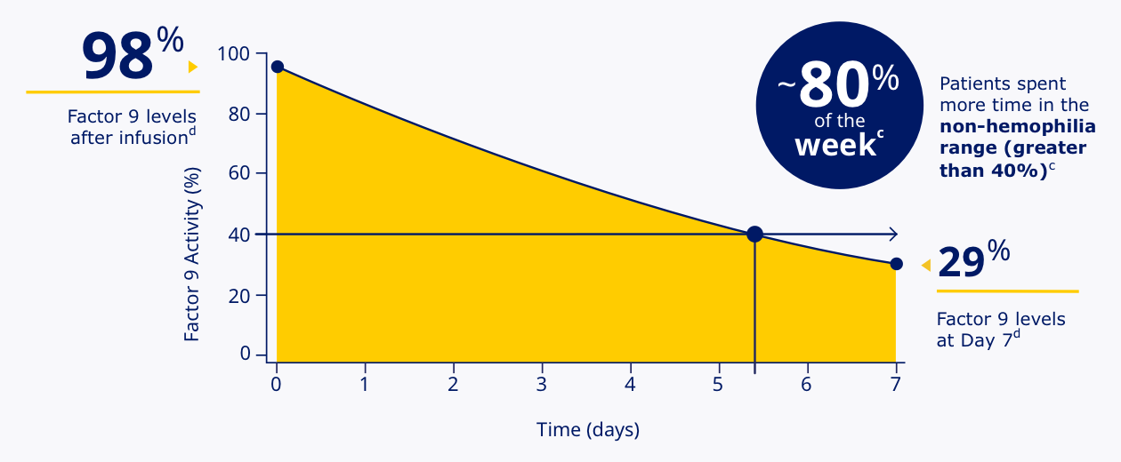 | cData represent mean steady-state pharmacokinetic profiles from previously treated adolescent/adult patients with moderate to severe hemophilia B (N=9) taking Rebinyn® 40 IU/kg once weekly. Factor 9 levels were within the non-hemophilia range (greater than 40%) for 5.4 days (approximately 80% of the week). |